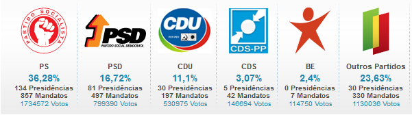 15. Não tive uma noite eleitoral perfeita. Basilio Horta ganhou Sintra numa eleição muito disputada. Mas para fim de festa dá o mote para o apuramento do vencedor final: o PS tem mais votos e mais câmaras. Ganhou. Sem discussão, ainda que tal vitória deva-se, sobretudo, a ter sido menos penalizado - que também o foi - do que o PSD. Mas, para que conste, não tão grande vitória quanto o grafismo do DN/JN a esta hora dá a entender (ali nos «outros partidos» estão as coligações do PSD e do CDS, mas a análise séria dos números fica para amanhã):